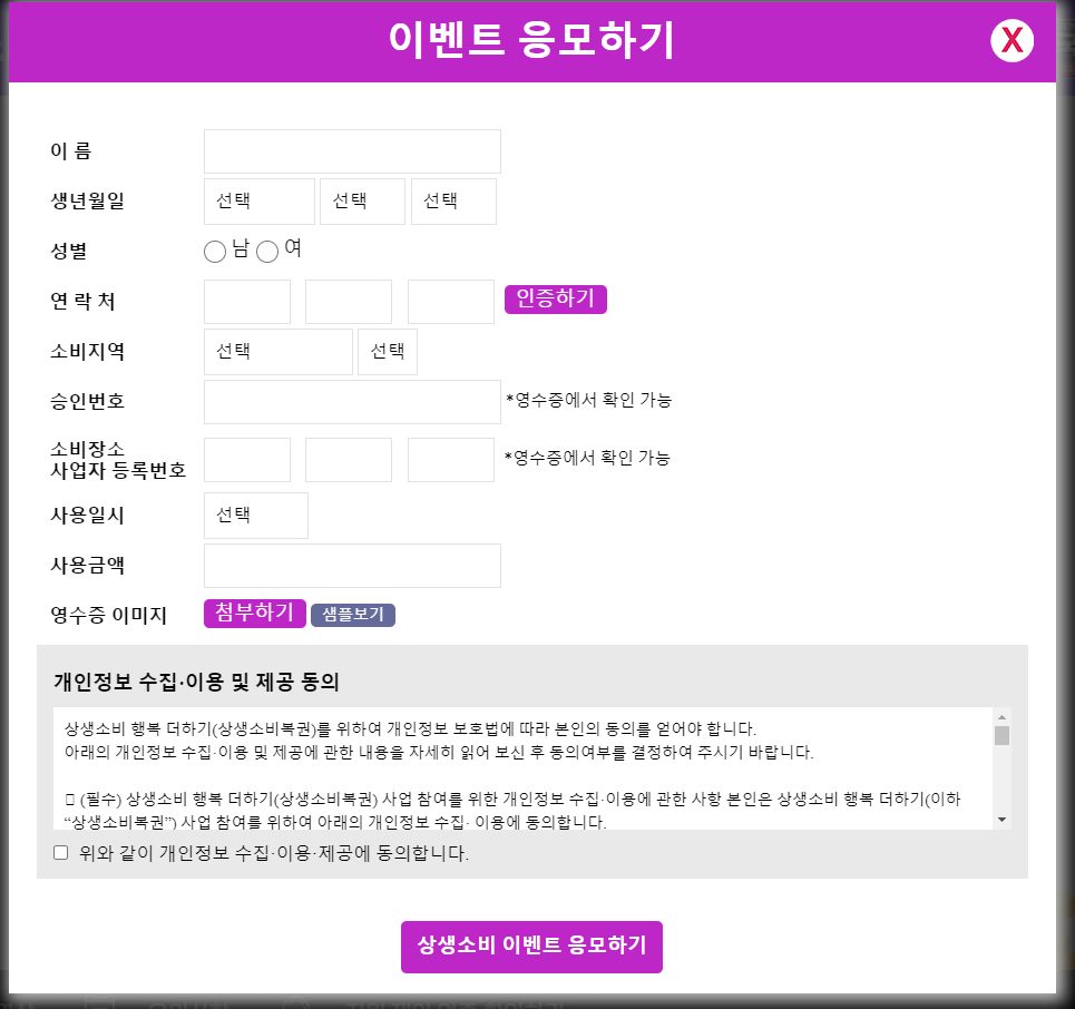 4. 이벤트 응모하기 페이지에서 개인정보를 입력하고, 영수증에 적힌 승인번호, 사업자 등록번호 등을 입력한다.