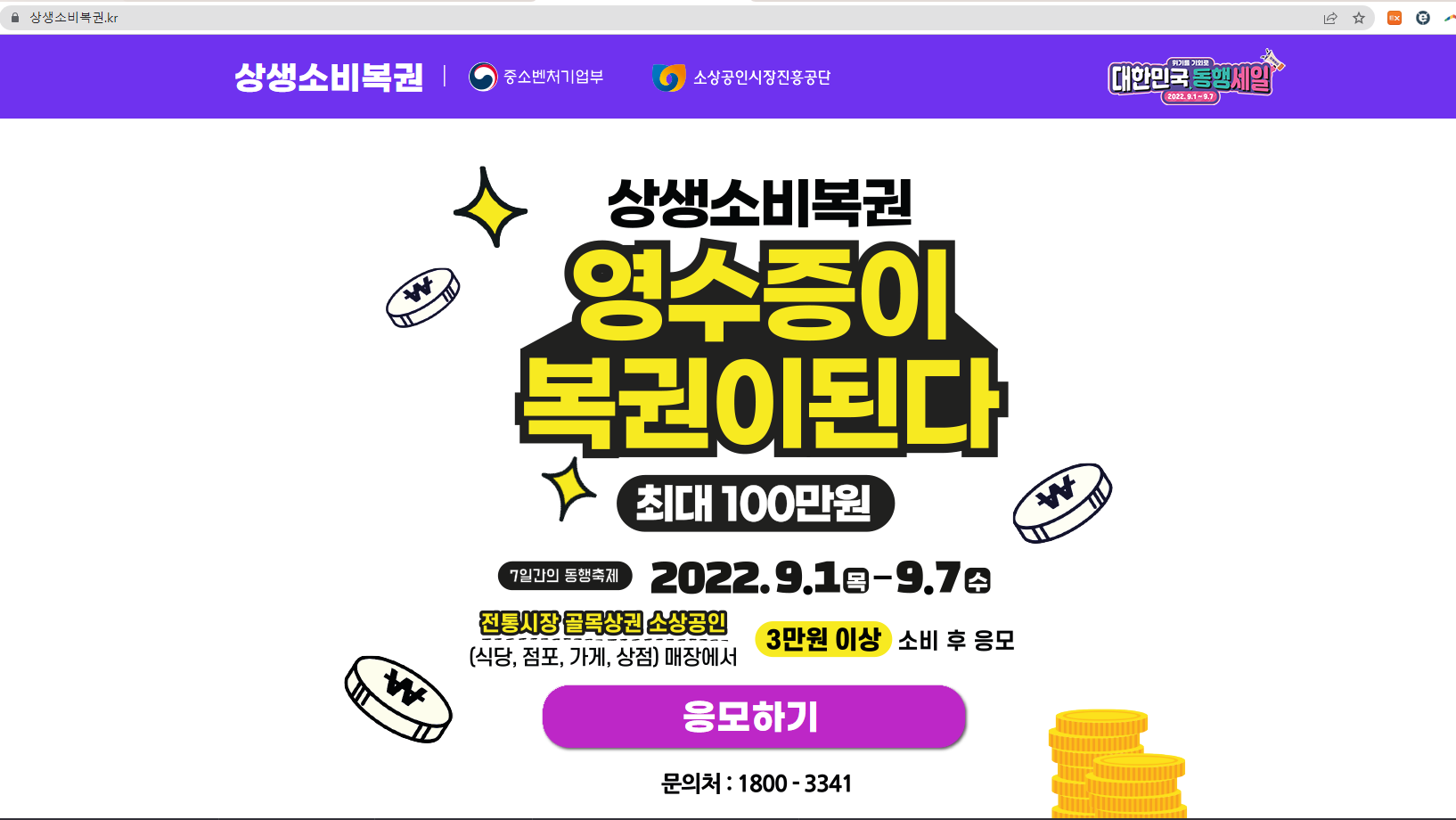 중소벤처기업부에서 사람들의 소비를 촉진시키기 위해 딱 1주일간 상생소비복권 행사를 하고 있다.