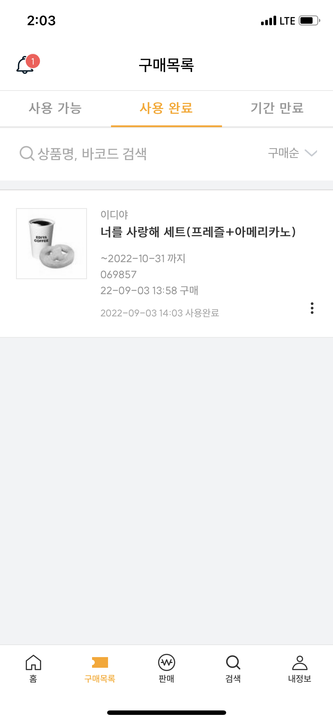 5. 결제가 완료되면 기프티콘이 구매목록에 사용 가능한 기프티콘으로 뜬다.