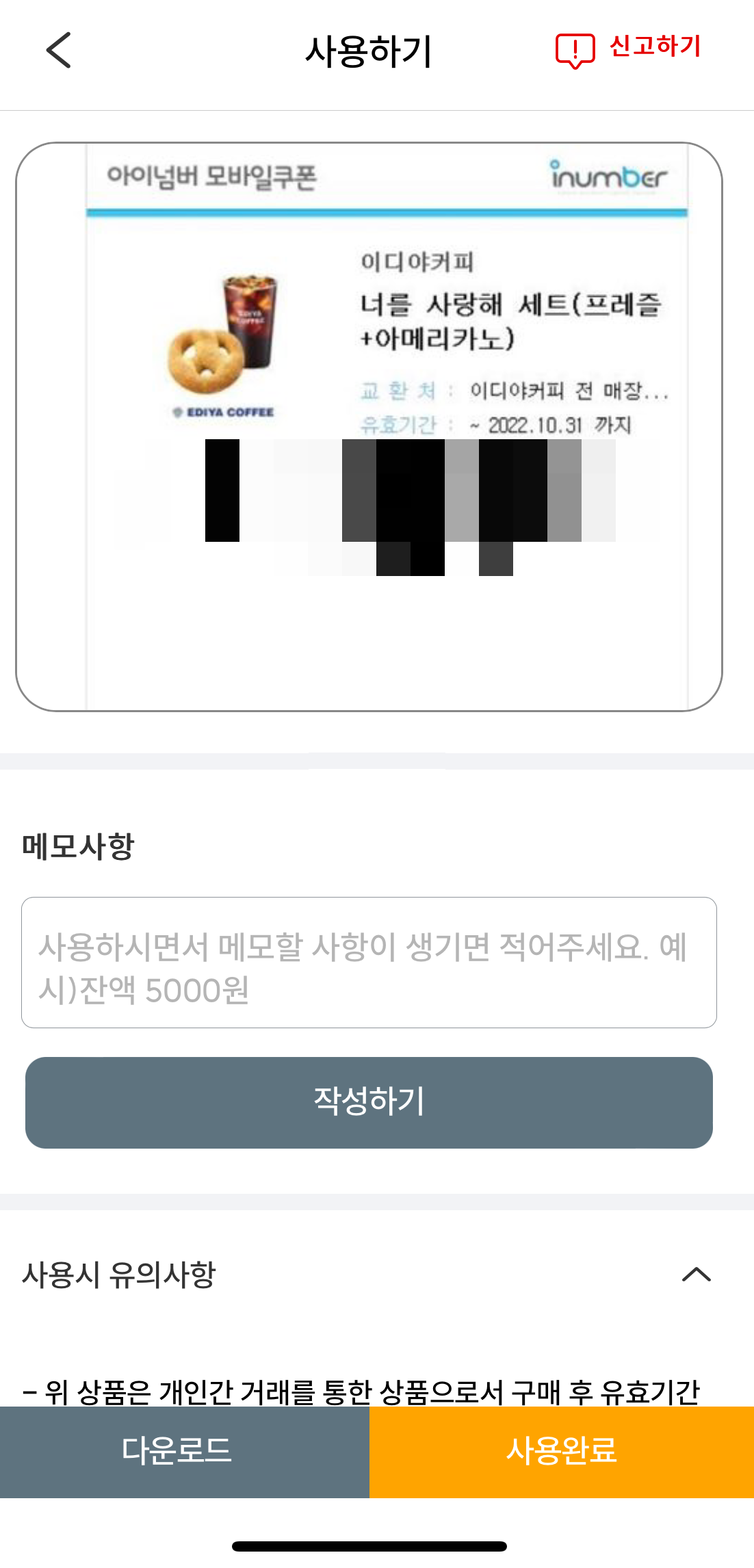 기프티콘을 사용하고 나면 '사용 완료' 버튼을 눌러 나중에라도 헷갈리지 않도록 한다.