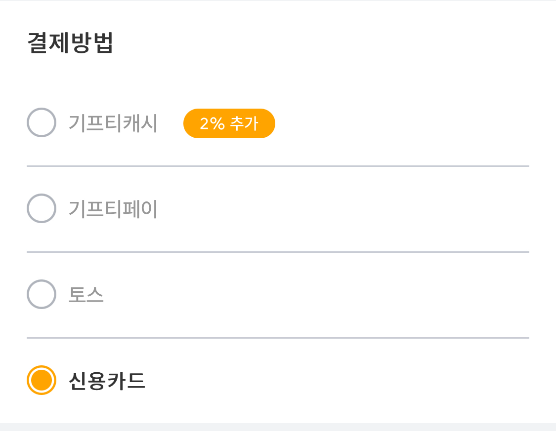 - 결제 방법은 기프티캐시·기프티페이·토스·신용카드 이렇게 4가지다. 나는 주로 신한Lpay를 즐겨쓴다.