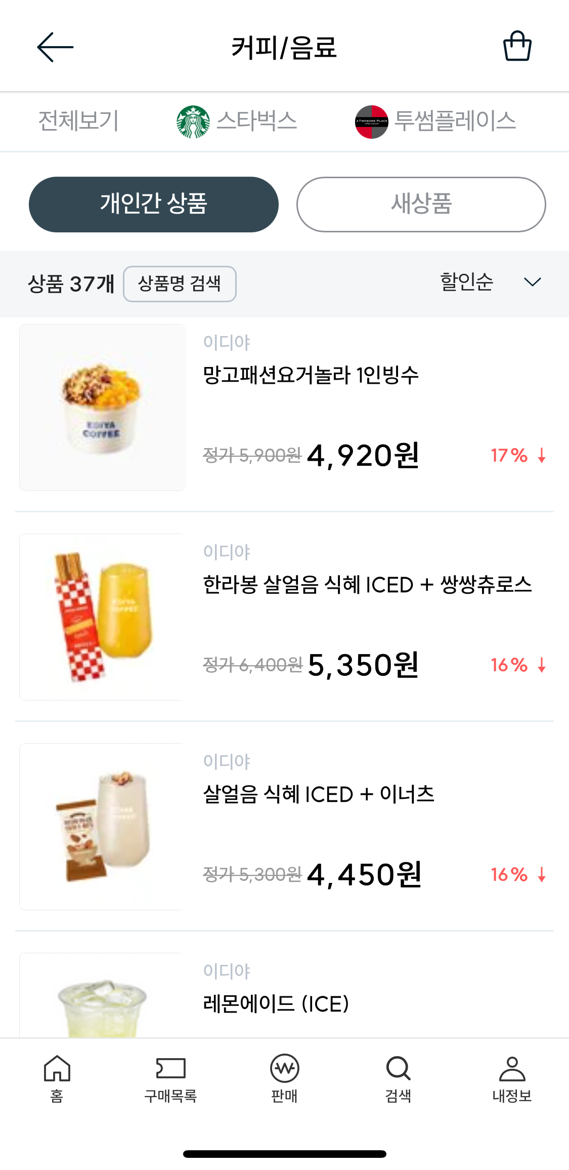 - 나는 이디야 커피로 검색했다. 최대 17% 할인된 금액으로 각종 기프티콘을 구매할 수 있다.
