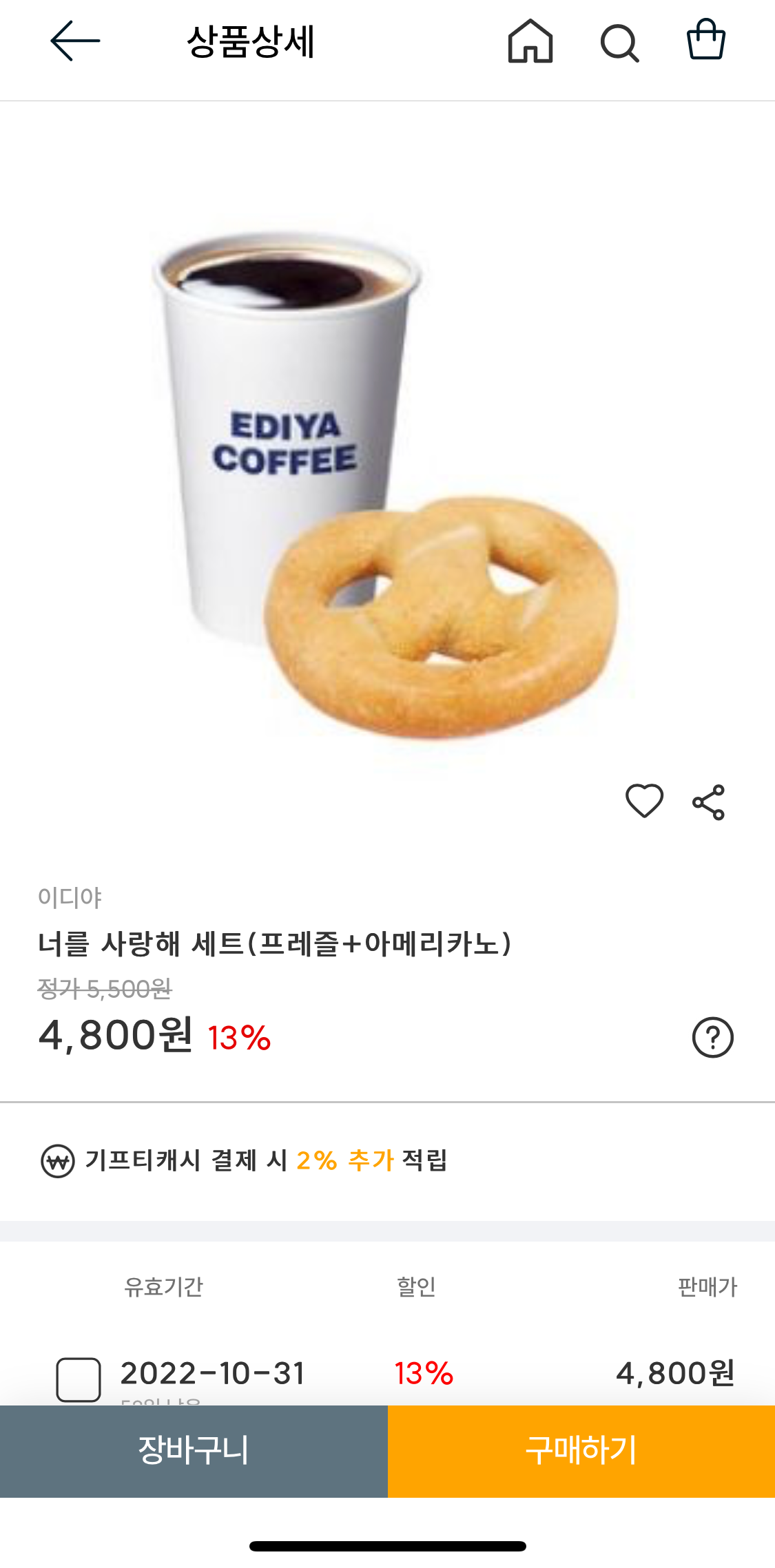 - 나는 점심 겸용으로 먹을 아메리카노와 프레즐 세트 기프티콘을 원가에서 13%나 할인된 4,800원으로 구매해보기로 했다. 앗싸 700원 세이브!