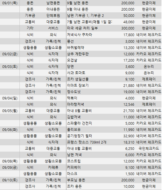 민족의 대 명절 추석이 있는 9월이 돌아왔다. 9월 1일부터 9월 10일까지의 지출을 돌아본다. 다른 달보다 가족 관련 지출이 많았던 9월 1주, 2주였다.