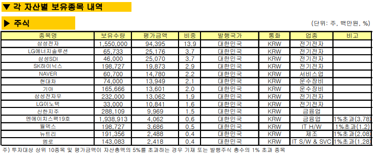 삼성전자가 살아야, 내 돈도 산다. 삼성전자가 가장 큰 비중으로 투자되고 있고 그다음이 LG에너지솔루션, 삼성SDI, SK하이닉스 순으로 투자가 되고 있다. 국내 주식에 투자하는 펀드이기 때문에 앞으로 대한민국의 경제가 전반적으로 좋아져야 내 돈도 불어나겠다. (너무 당연한 소리일까?)