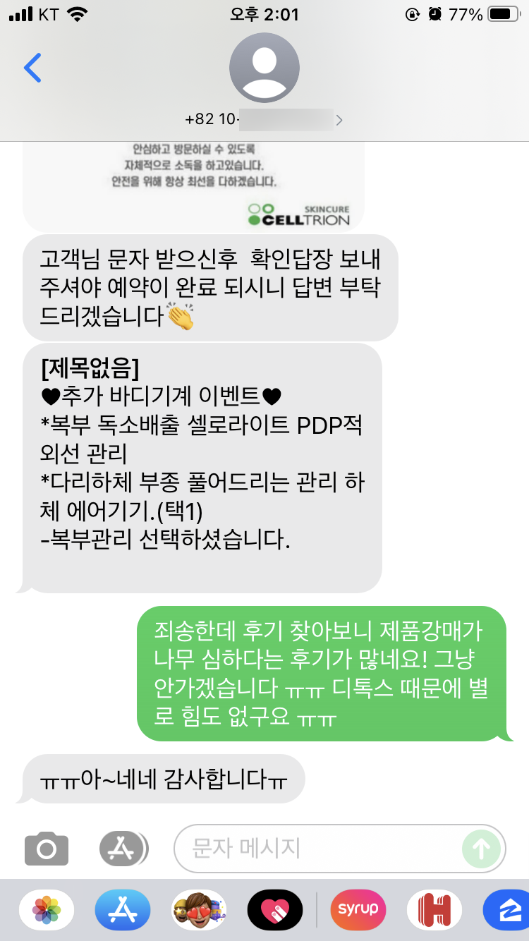 그때 마침 계속 재택근무를 하고 있었고, 한창 디톡스 중이라서 몸 상태에 귀를 기울이고 있는 상태였어서 영업에 거의 넘어가서 전화를 받은 당일 저녁에 예약 취소한 사람이 있어서 당장 와도 된다고 하길래 일단 알겠다고 했다. 안내 문자 받은 후에 예약 확정한다는 문자 답장을 꼭 보내달라고 전화를 끊으면서 내게 당부했다.