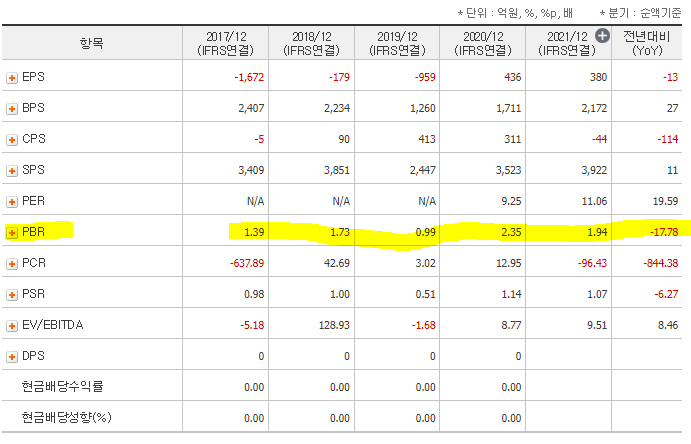 오른쪽 '투자정보' 아랫부분에 PBR이 나와있다.