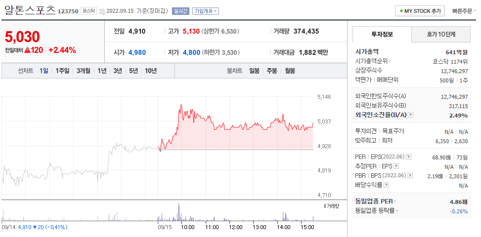 연습삼아 알톤스포츠 PBR을 확인해보자. 네이버 주식에서 '알톤스포츠'를 검색한다.