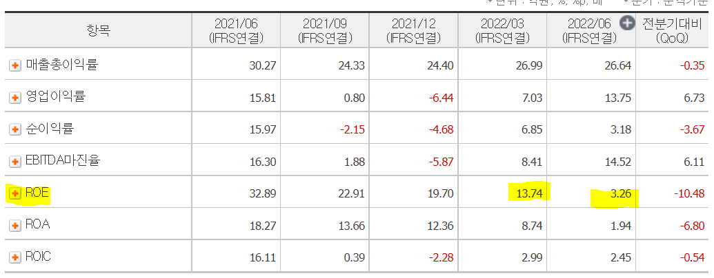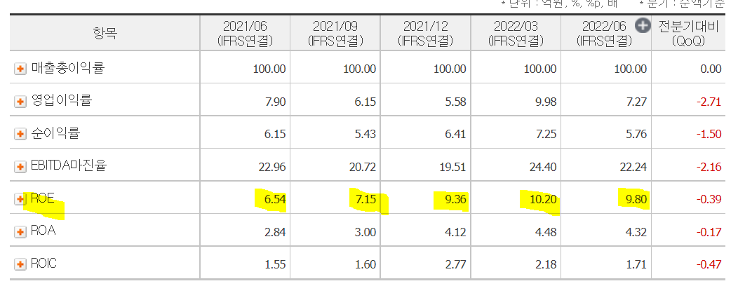 2020년에는 겨우 29.7로 올라왔다가 2021년에는 악화된 실적 19.7%를 기록했다. 올해는 작년보다 ROE가 좋아질까? 분기 별 ROE를 통해서 엿보자.