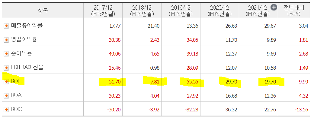 네이버 주식 '알톤스포츠' 페이지에서 종목분석 - 투자지표 탭에 들어가면 아래와 같이 ROE가 적힌 테이블이 있다.