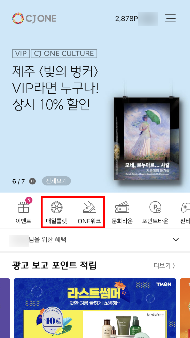 CJ ONE앱에서는 매일 룰렛과 ONE워크로 CJ 포인트를 모을 수가 있어요.