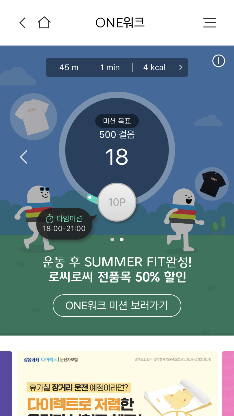 ONE워크에서는 '미션 목표'라는 게 있는데 CJ ONE 앱이 제시하는 특정 시간 안에 500걸음을 걸으면 10P를 주는 미션 이벤트입니다. 지금 타임 미션은 18:00~21:00로 지정되어 있는데, 이 시간이면 퇴근시간이라서 500보 걷는 것은 식은 죽 먹기죠... 잊지 말고 밤 12시가 되기 전에 접속해서 버튼을 눌러 10P를 적립받으면 됩니다.