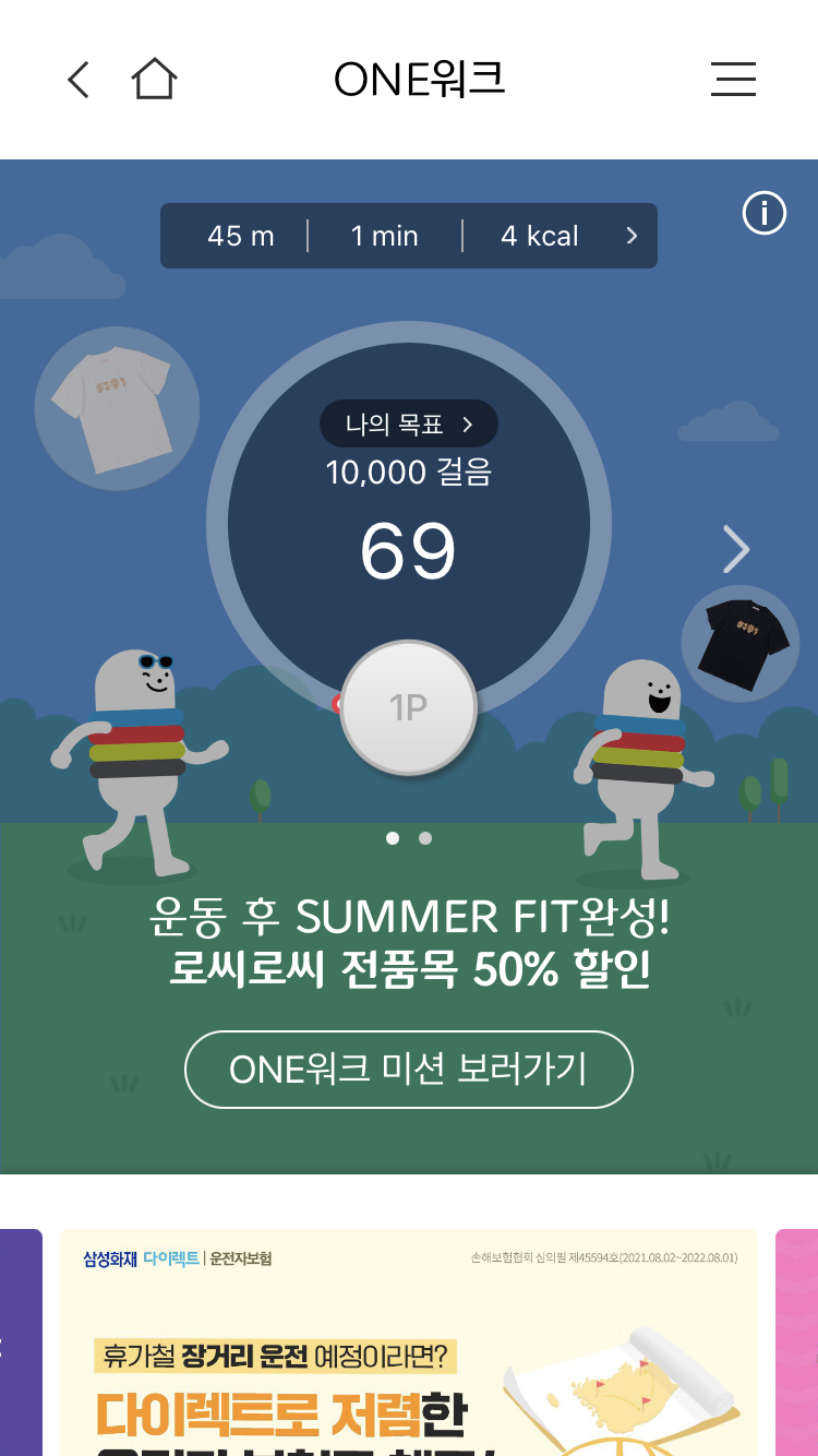 매일 룰렛은 '출석체크'와 같은 개념이라고 생각하시면 되구요, 'ONE 워크'는 만보기 기능에 포인트까지 모으는 기능이라고 보시면 됩니다.
