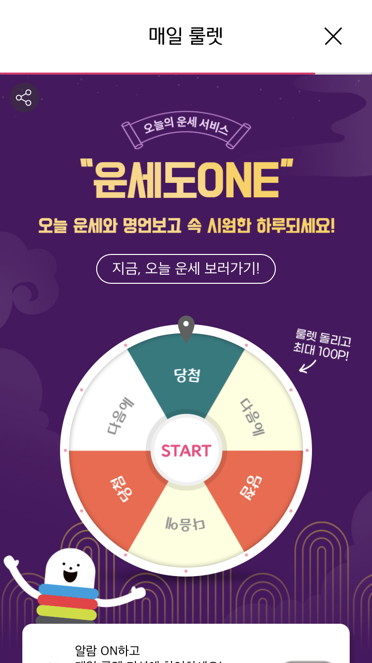 가운데 START 버튼을 누르면 룰렛이 돌아가면서 '당첨' 또는 '다음에'가 걸리게 되는데요, 제가 지금 약 3달 동안 이 룰렛을 돌리면서 '다음에'가 나왔던 적은 딱 한 번 있었습니다. 거의 대부분 '당첨'이 되는데, 보통 1P나 2P씩 받습니다. 룰렛을 돌려서 받을 수 있는 최대 포인트인 100P는 한 번도 받아본 적이 없네요... ㅠㅠ