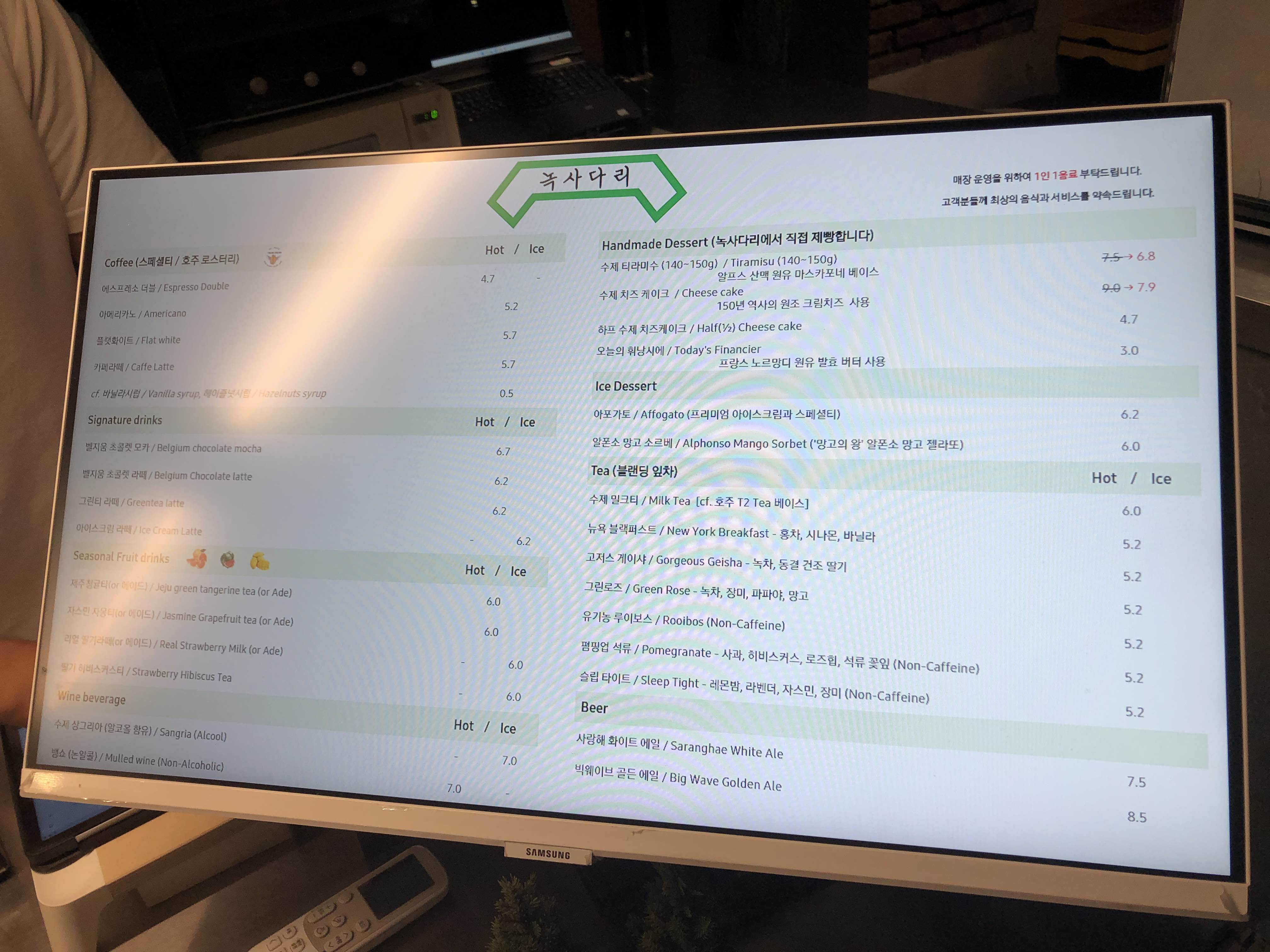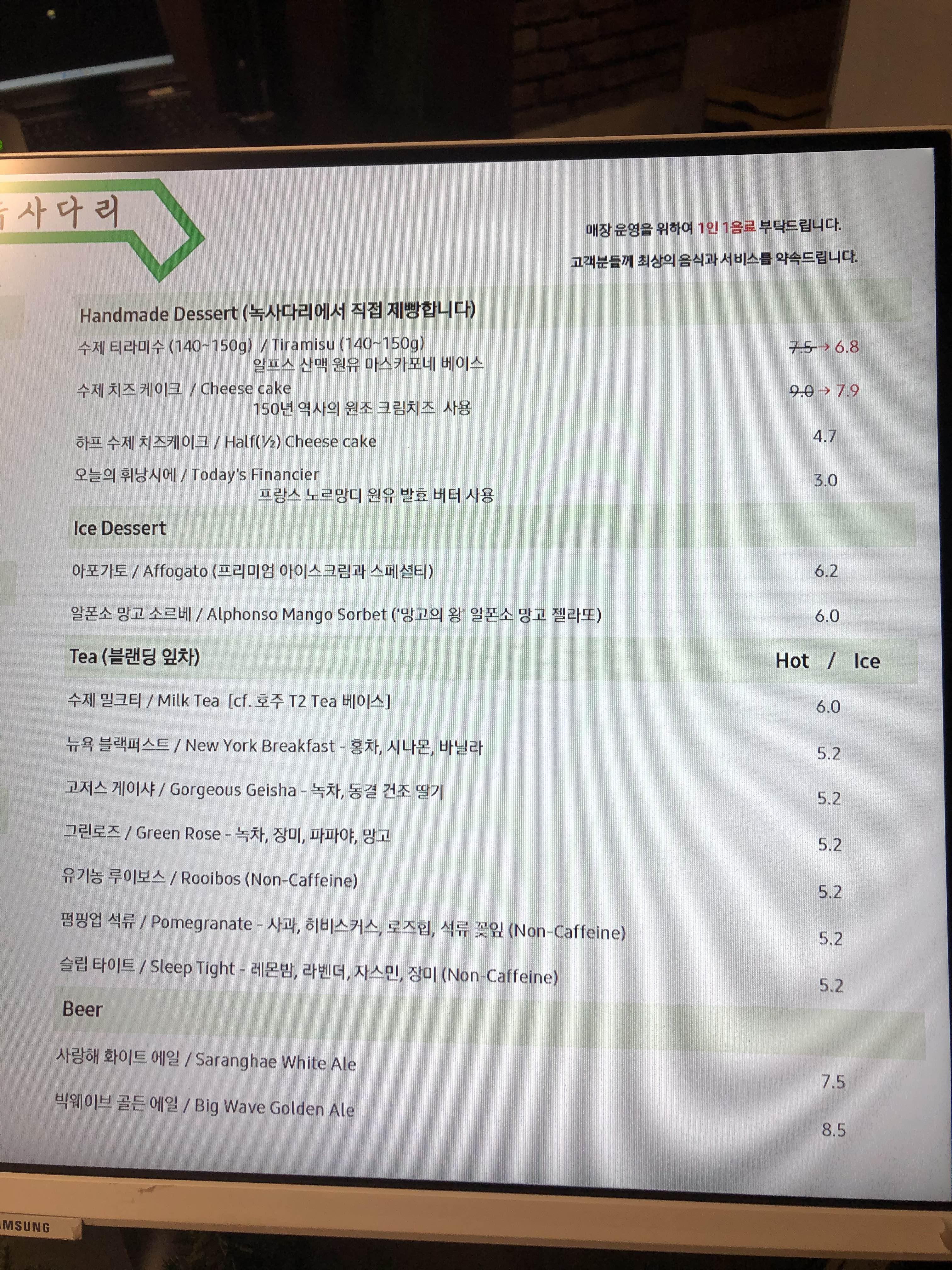 조명 때문에 메뉴판이 잘 안보일 수도 있어 확대해서 한쪽씩 찍어보았다. 녹사다리 메뉴는 아래 사진 참고!