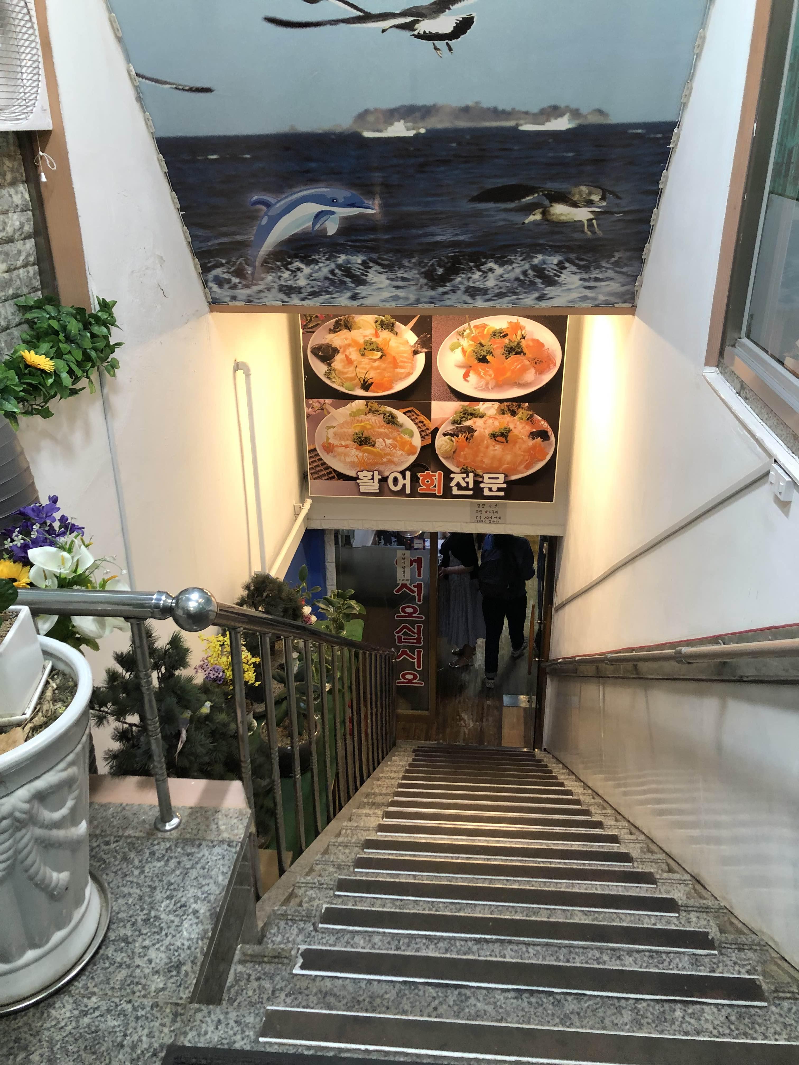 돌고래 횟집은 지하에 있다. 문을 열고 지하에 있는 돌고래 횟집으로 들어갔다.