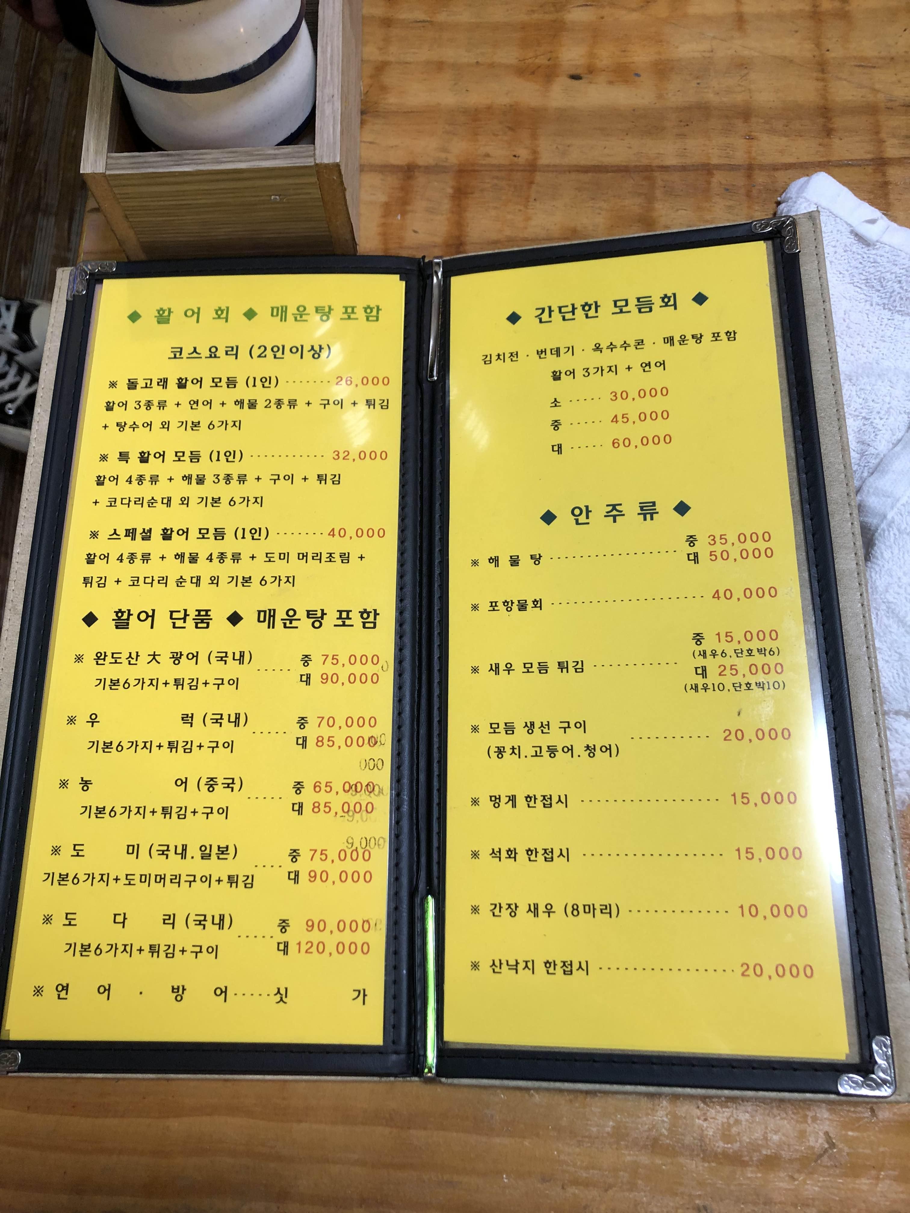 돌고래 횟집에 도착해 정식 메뉴판을 열어 보았다. 우리가 사려고 하는 모둠회는 소 사이즈가 30,000원, 중 사이즈가 45,000원, 대 사이즈가 60,000원이다.