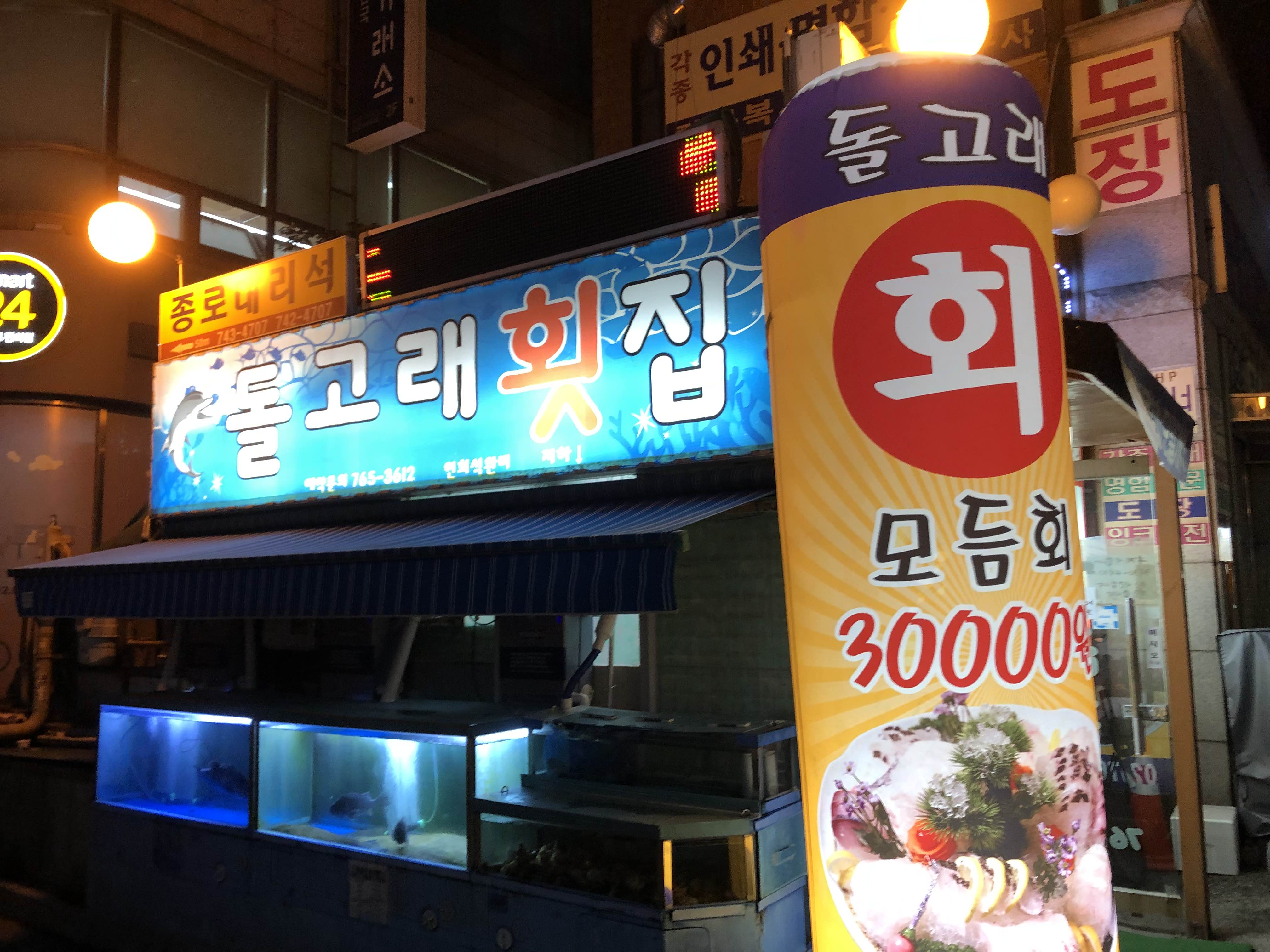 돌고래횟집은 종로3가역 7번 출구 바로 앞에 있는 역세권 횟집이다.