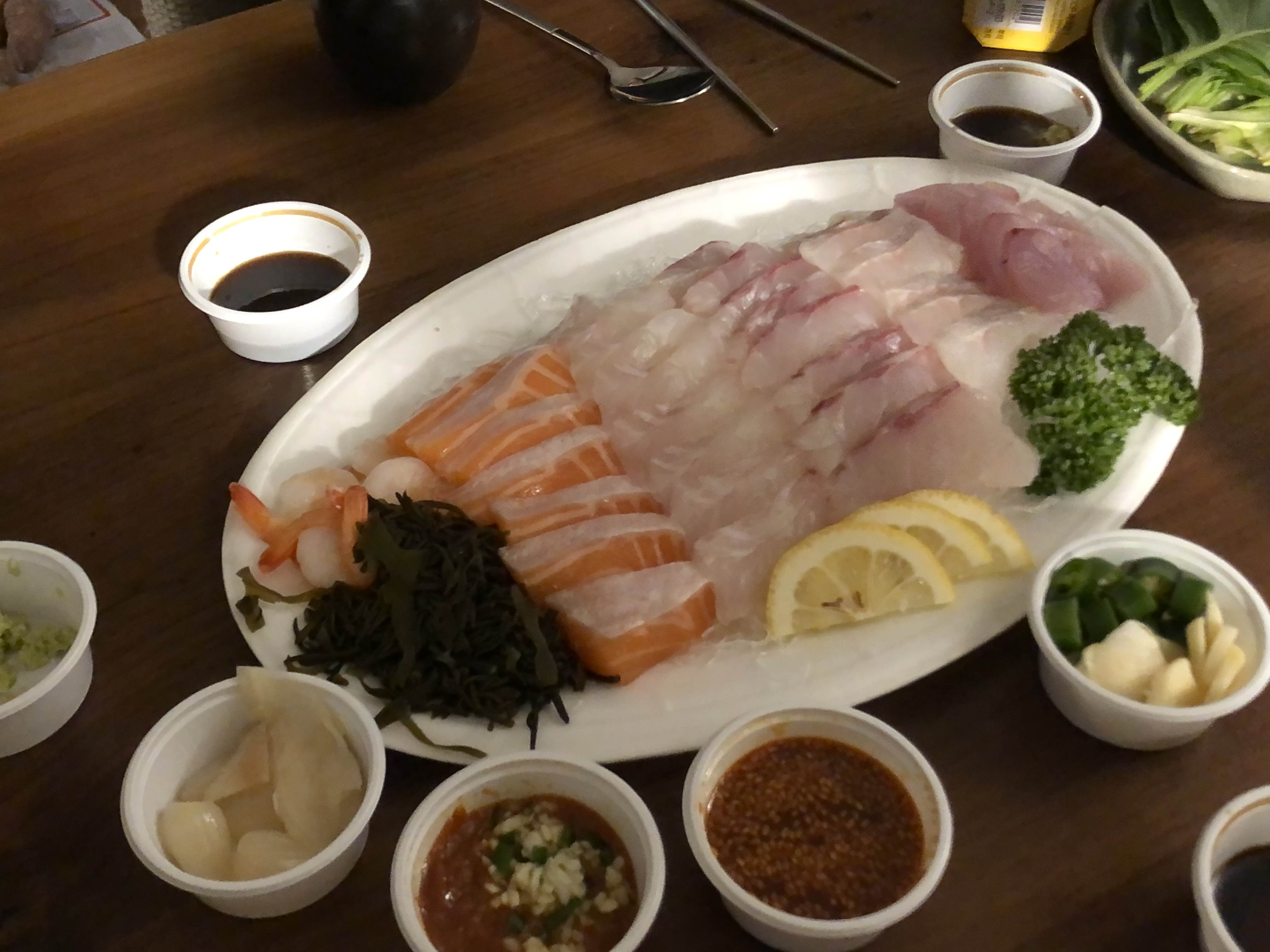 한 접시의 회와 함께 깻잎, 상추, 간장, 와사비, 마늘 쌈장, 고추장 등도 함께 포장해주셨다. 양껏 먹기에 회의 양은 적은 편이었지만 서울 한복판에서 사 먹는 회가 저렴할 수는 없다고 생각하며, 한점 한점 소중하게 먹었다.