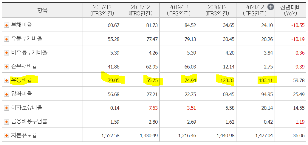 지난 5년간 꾸준히 안정적인 유동비율을 보인다.