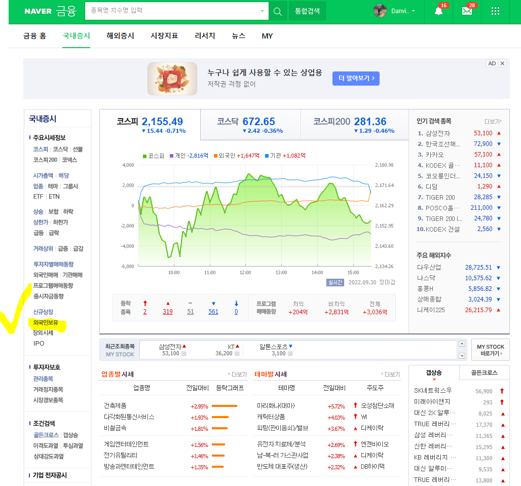네이버 금융 페이지에서 '국내 증시'에 들어간다. 그다음 왼쪽 탭에서 '외국인 보유'를 클릭한다.