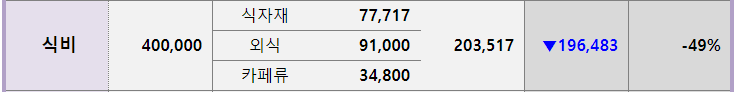 한달의 반이 지난 시점, 식비 예산의 49%가 남았다. 매우 바람직하다. 외식의 대부분은 도서관에서 먹은 점심 또는 저녁, 그리고 김밥이다. 정말 외식 다운 외식은 연휴에 친구들과 함께 평양냉면을 먹으러 간 건 (32,500원), 그리고 발레 공연을 보러 가기 전에 먹은 칼국수(21,000원) 이렇게 두 건이다.