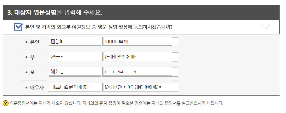 '3. 대상자 영문성명을 입력해 주세요.' 칸에서 네모 박스 (본인 및 가족의 외교부 여권정보 중 영문 성명 활용에 동의하시겠습니까?)에 클릭을 하면 자동으로 영어 이름이 세팅되어야 한다.