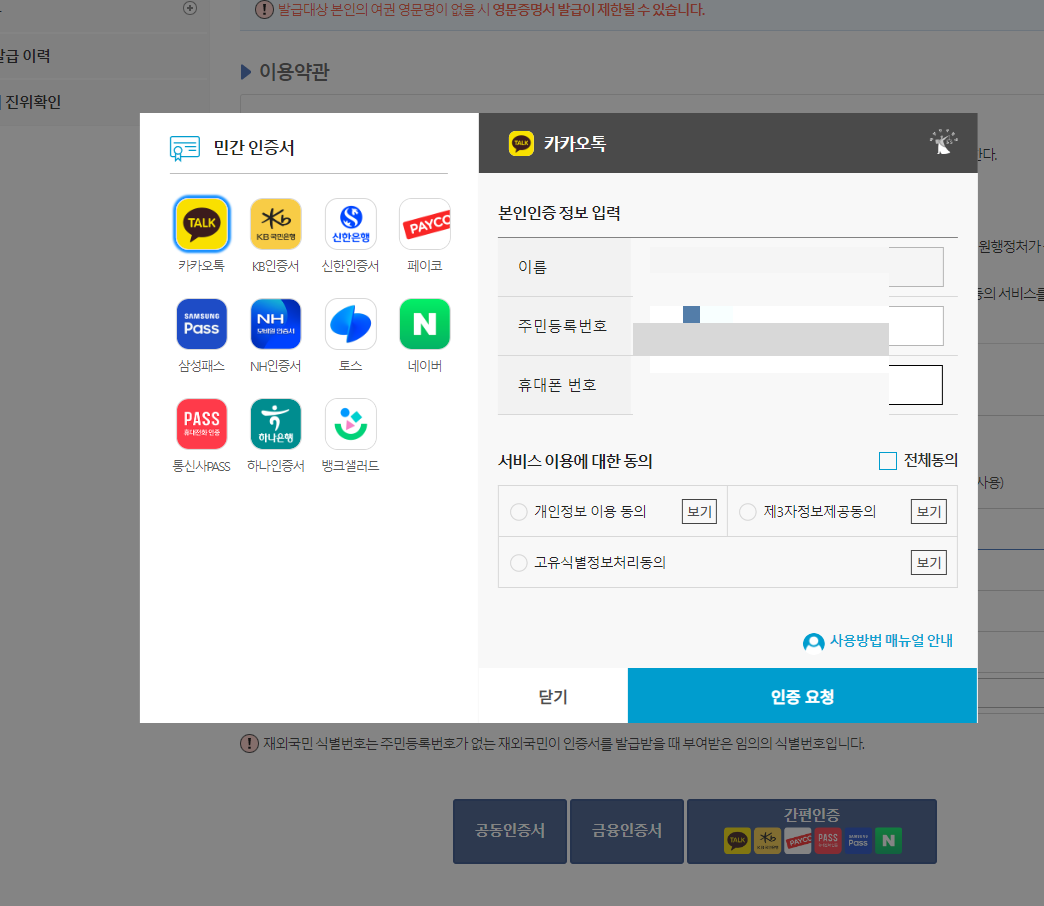 위의 창이 뜨면 이름과 주민등록번호, 추가정보 확인에 엄마 이름이나 아빠 이름 등을 넣고, 하단에 인증버튼을 누른다. 나는 간편 인증을 선택했다.