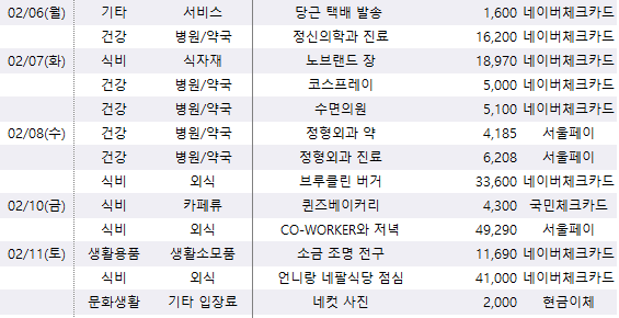 소비횟수는 적지만, 외식비로 굵직하게 돈을 많이 쓴 2월 둘째주 가계부 리뷰를 시작한다.