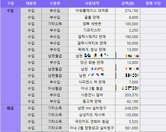 남편이 2월에 벌어온 돈은 작고 소중했다. 하지만 정말 감사하게도 2월에 부수입이 이래저래 발생했다. 집정리를 하느라 열심히 당근마켓에서 물건을 팔았고, 지난 1월 사촌언니를 도와준 노동 값도 받았다. 아워플레이스를 통해 우리 집을 대여해서 얻은 수익료도 우리 가계에 아주 큰 도움이 될 예정이다.