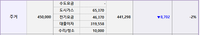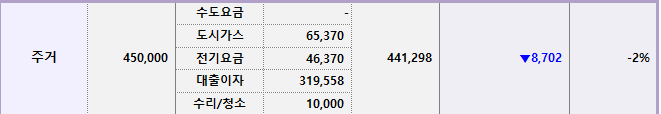 이번 달에는 수도요금이 나가는 달이 아니라서 45만 원 이내에서 주거비 지출을 끝낼 수 있었다. 도시가스 요금이 꽤 많이 나왔고 전기요금도 지난달보다 더 많이 나왔다.