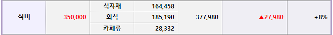 식비는 나의 해외출장과 남편의 디톡스를 고려해 매우 타이트하게 잡았는데 꽤 선방했다. 27,980원을 초과했고, 외식의 비중이 식자재 구입의 비중보다 더 컸다. 어디 어디에서 누구와 외식을 했나 보니;