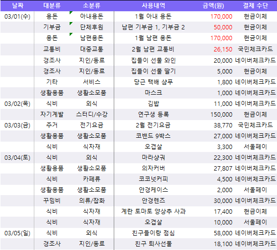 3월 1일부터 3월 5일까지의 가계부를 리뷰해 본다. 3월에는 친구, 가족들과 어울려 놀며 발생하는 지출이 많을 것으로 예상된다. 그러니 남편과 단 둘이 있을 때는 최대한 집에서 밥을 해 먹고 알뜰살뜰하게 현명한 소비를 해야 한다.
