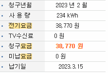 1월 전기요금 38,770원이 고지되었다. 내가 1주일 간 한국을 떠나 있어서 그런지 1월보다 전기요금이 더 적게 나왔다.
