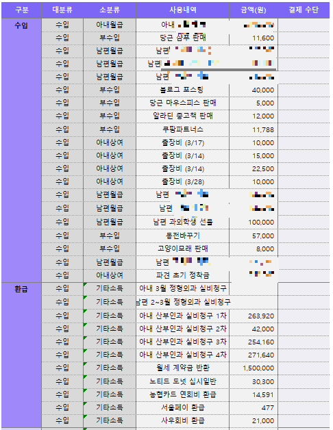 해외로 이주를 앞두고 있다. 그렇다 보니 앞으로 보고 싶을 사람들에게 인사하느라고 외식비로 많은 돈을 쓰고 필요한 물건들을 사느라 크고 작은 지출이 발생했다. 아직 3월이 끝나려면 하루가 남았지만, 내일 출국하기 전 오늘 월마감을 하려고 한다. 결과적으로 이번 3월 한 달의 지출은 역대급! 무려 100만 원 이상을 초과지출했다. 뼈 때리는 3월 가계부 리뷰 시작!