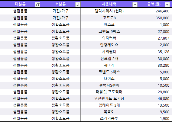 2월에 신용카드로 긁은 남편의 갤럭시워치 (246,460원), 그리고 해외 이주를 기념(?) 하며 당근마켓에서 현금으로 구매한 고프로 8 (350,000)이다.