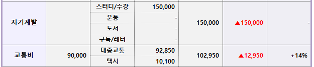 계획에는 없던 남편 대학원 연구생 등록비를 지출했다. 하지만 해외에서도 인터넷 도서관을 이용하려면 꼭 필요한 지출이다. 교통비로는 고등학교 선생님 뵈러 갈 때 택시를 타서 초과지출되었다.