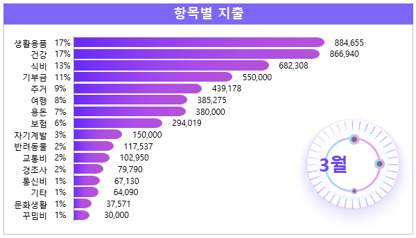 어디에 이렇게 돈을 썼을까 ^^ 더 소름 돋는 사실은 3월에 신용카드로 긁은 지출건이 많아서 다음 달 지출액은 3월보다 더 많은 예정이라는 것이다.