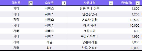 당근마켓에서 물건을 판매하느라 쓴 택배비, 아빠를 위한 변호사 상담 비용, 남편의 여권 사진 촬영 등이 지출되었고, 신용카드 연회비 3만 원이 빠져나갔다.