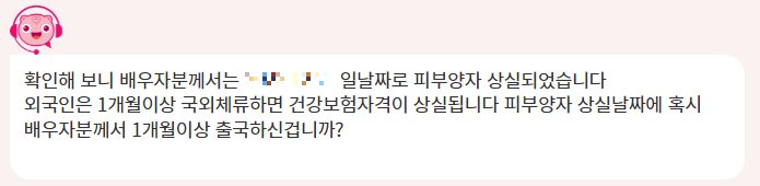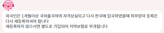 알고 보니, 외국인은 1개월 이상 한국을 떠나 있으면 자동으로 국민건강보험 자격을 상실한다. 피부양자로 등록이 되어 있었든, 지역가입자로 가입이 되어 있었든 국민건강보험에 더 이상 가입되어 있지 않는다는 말이다.