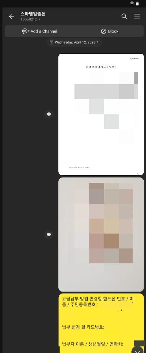 스마텔의 안내대로 가족관계증명서와 나의 신분증 사진 (뒷자리는 가려서) 을 찍어 보냈다. 그리고 제출해야 하는 정보는 채팅창에 입력해 정보를 보냈다.