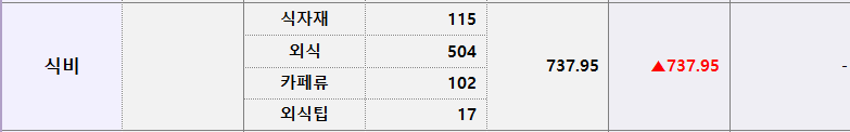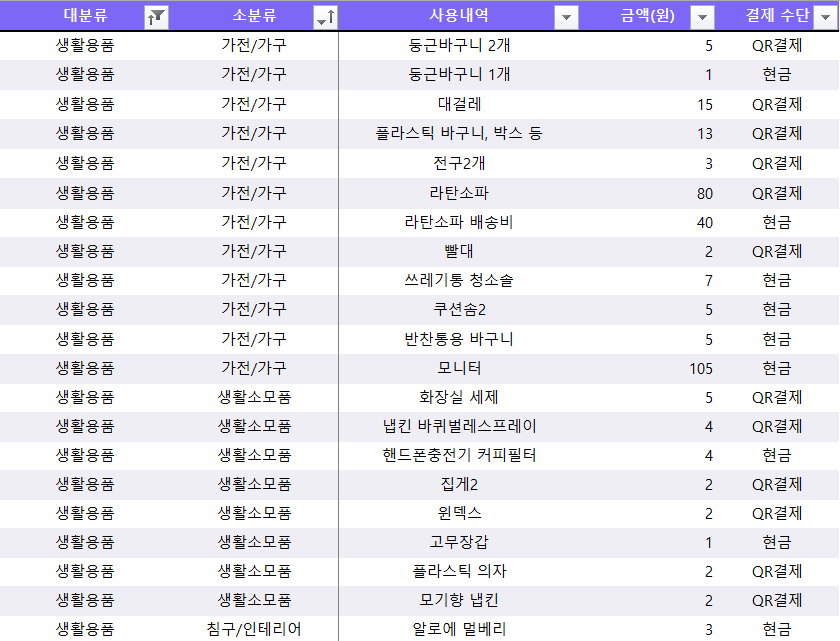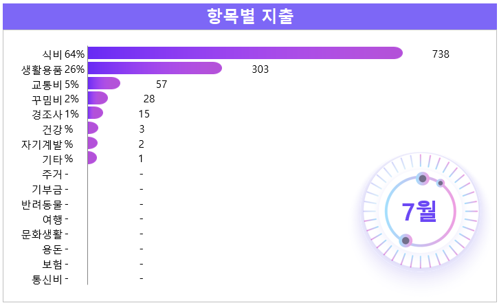 7월 지출 1위는 (언제나 그렇듯) 식비, 2위는 생활용품, 3위는 교통비다. 그럼 각 항목별로 어떻게 지출되었는지 좀 더 자세히 살펴보자.