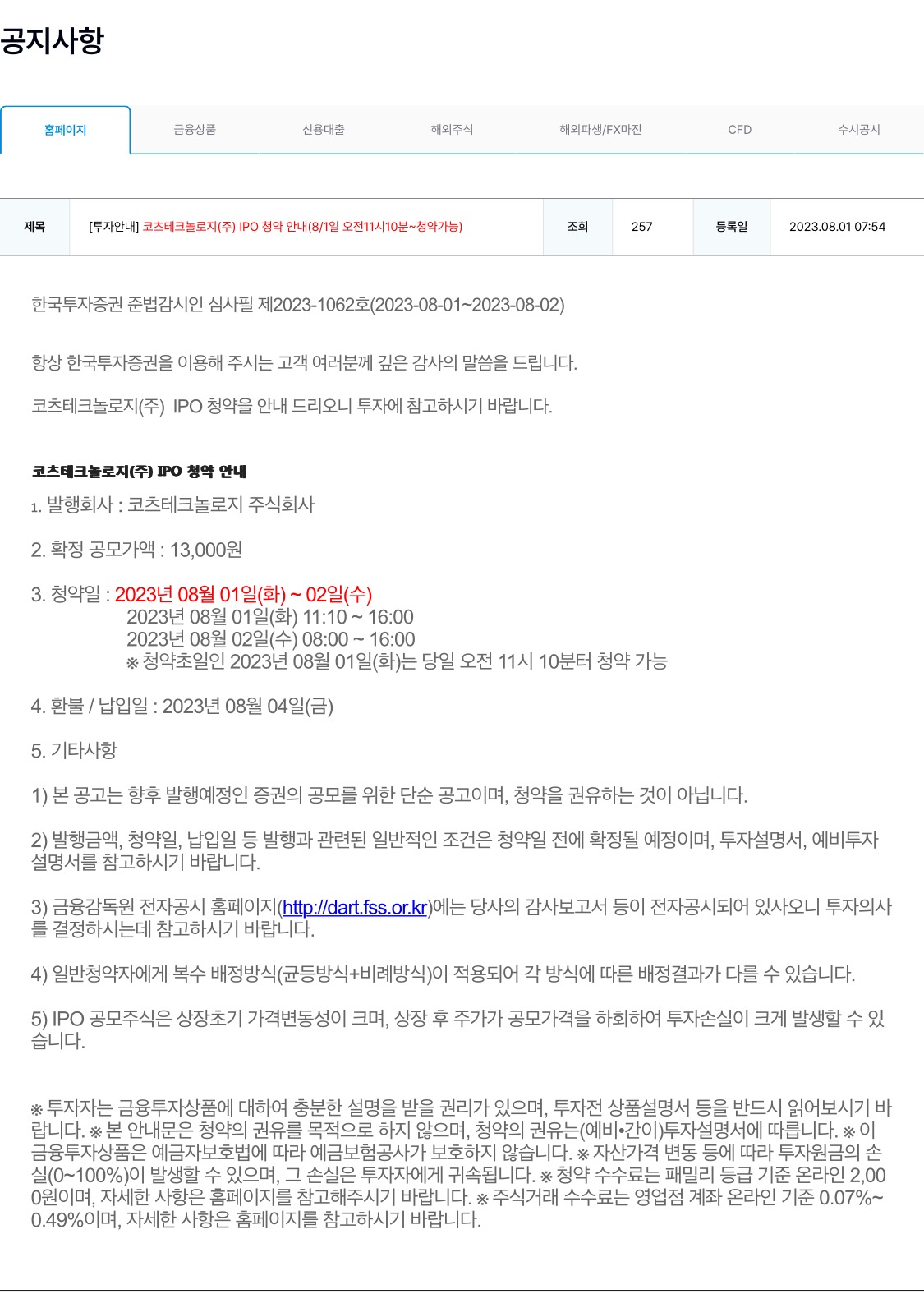 공모주별로 청약 시간이 상이할 수 있으며, 매번 공모주 청약 가능 시간은 한국투자증권 홈페이지 공지사항에서 확인할 수 있다. 코츠테크놀로지 공모주 청약은 8월 2일에는 오전 8시부터 오후 4시까지 할 수 있다고 한다.