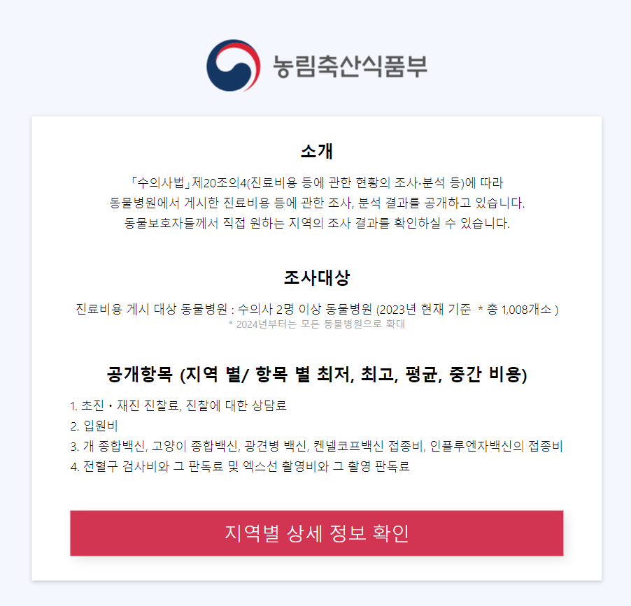 '수의사법' 제20조의4(진료비용 등에 관한 현황의 조사‧분석 등)에 따라 동물병원에서 게시한 진료비용 등에 관한 조사, 분석 결과를 공개한다. 동물보호자들이 직접 원하는 지역의 조사 결과를 확인할 수 있다.