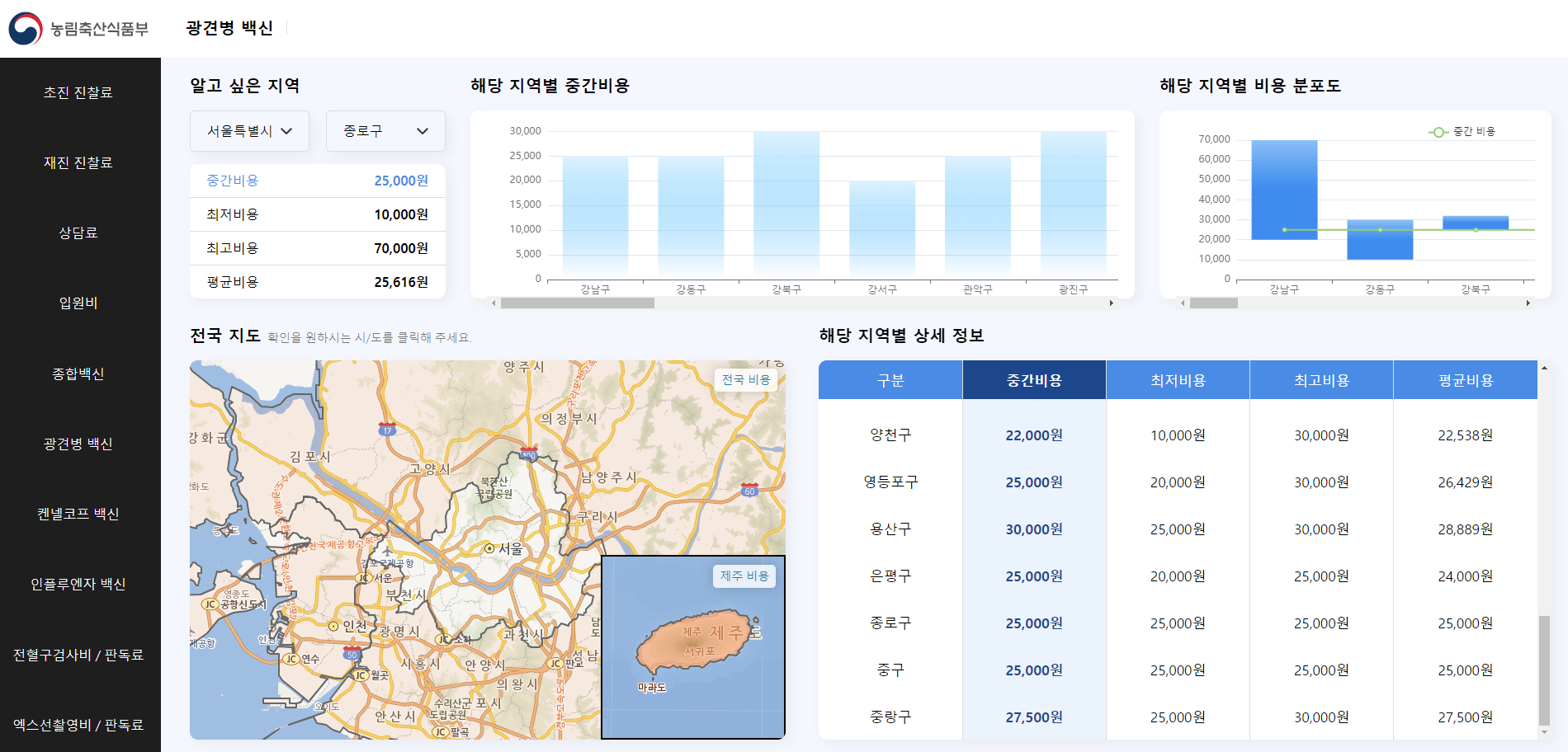 알고 싶은 항목을 클릭한 뒤에, 윗쪽 '알고 싶은 지역'에 '시'와 '구'를 넣으면, 중간비용, 최저비용, 최고비용, 평균비용이 나온다. 이렇게라도 비용을 알고 동물병원에 가면, 이 병원이 부르는 비용이 비쌌는지 싼지 알 수 있고 공개된 자료를 바탕으로 수의사들에게 딜을 걸어볼 수 도 있지 않을까? "정부가 공개한 자료 보니까 서울시 종로구 광견병 주사 평균 비용이 25,000원이던데.. 왜 여기는 70,000원이에요?" 라며 말이다.