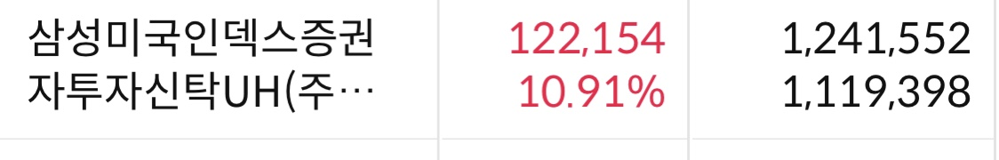 나의 삼성미국인덱스증권자투자신탁UH(주식)-Ae 펀드는 수익률 10.91%를 기록하고 있다. 작고 소중한 1,119,398원이 펀드에 들어가 있고, 현재 평가금액은 1,241,552원이다. 주식 시장이 안 좋을 때 수익률이 마이너스인 적도 있었는데, 그냥 그러려니 하고 기계식으로 한 달에 5만 원씩 계속해서 추가 매수했다.