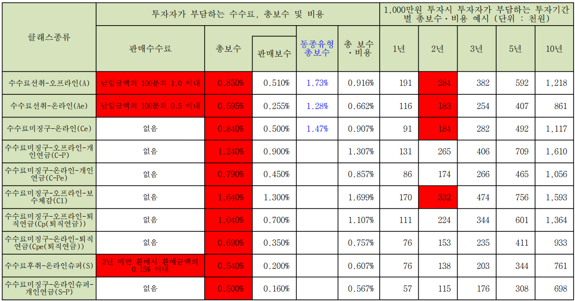 내가 보유한 펀드는 Ae형이다. 총 10가지 종류의 클래스 중에서도 수수료 선취 온라인 형이다. 10년 이상 투자했을 시 총 보수와 운용비용이 가장 낮다. 납입금액의 0.5% 이내 수수료, 0.595%의 총보수가 발생한다.