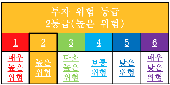 예금보험공사가 보호하지 않는 상품이므로 원금 손실의 위험이 당연히 있다. 1~6등급의 위험 등급 중, 이 펀드는 2등급의 위험도, '높은 위험'이 있는 상품이다.