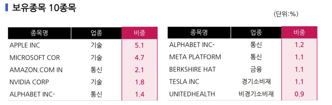 일단 현재 수익률이 10%가 넘어가서 기분은 좋다. 기분 좋으니까 삼성미국인덱스증권자투자신탁UH(주식)-Ae 포트폴리오는 어떻게 생겼나 좀 공부해 보자. (여러분은 저처럼 아묻따 투자 하지 마세요... 모든 투자 결정은 스스로 공부해서 할 것...!)