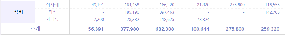 해외로 나온 후에는, 가끔 현지에서 받은 생활비가 다 떨어졌을 때 트레블 월렛으로 한국돈을 가져와 달러로 충전해 카드 사용이 가능한 식당이나 식료품 점에서 카드를 긁었다. 이것이 바로 4월~6월에 한국 가계부에 잡힌 식비다.